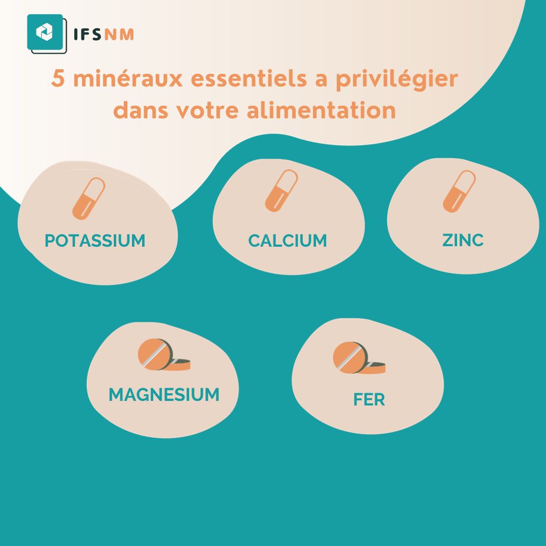 Cinq minéraux doivent être surveillés dans votre alimentation : le potassium, le zinc, le calcium, le magnésium et le fer.