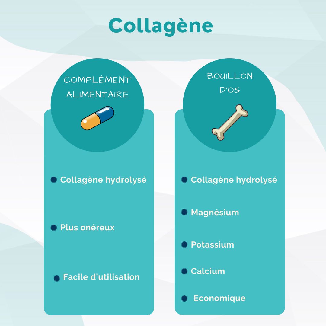 Les compléments alimentaires offrent une autre source de collagène, généralement dérivée de gélatine animale ou de sous-produits de poisson. Ils sont souvent hydrolysés pour faciliter l'absorption mais lorsqu'on prépare un bouillon d'os, on hydrolyse également le collagène. L'avantage des aliments par rapport aux compléments alimentaires réside dans la synergie entre les micronutriments et les acides aminés du collagène.