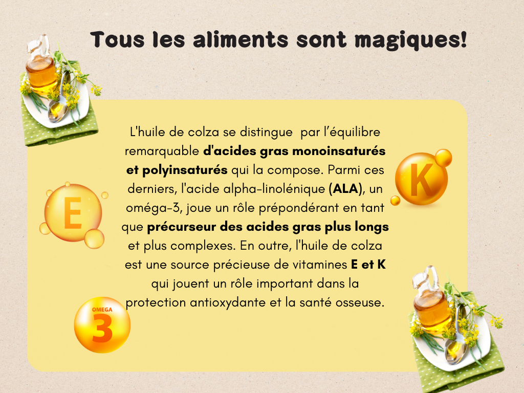 Ces idées montrent que l'huile de colza peut être facilement intégrée dans une variété de plats, des entrées aux plats principaux, en passant par les accompagnements, offrant non seulement un profil nutritionnel enrichi mais aussi de nouvelles saveurs à vos repas.