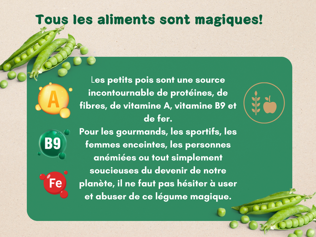 Les petits pois se distinguent des légumes classiques notamment par leur richesse en protéines, rejoignant les haricots blancs avec 6 g de protéines pour 100g de petits pois cuits. C’est à dire autant que les haricots blancs. Cette teneur élevée en protéines en fait un allié de choix pour les végétariens, les sportifs et toutes les personnes qui cherchent à enrichir leur alimentation en protéines d'origine végétale.